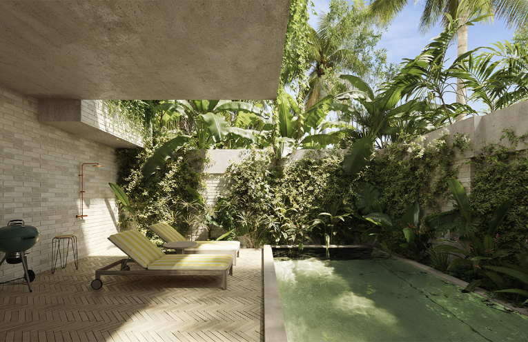 Zona común con alberca, asador y espacios rodeados de vegetación nativa para relajarte, trabajar o convivir.