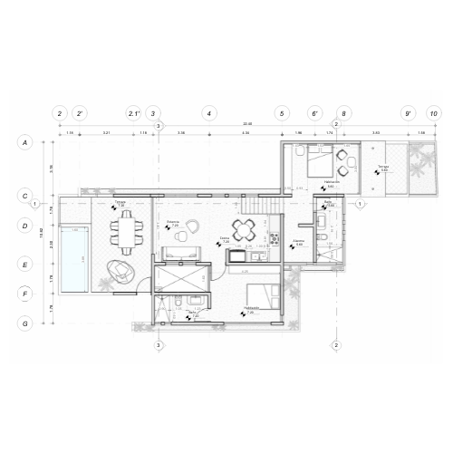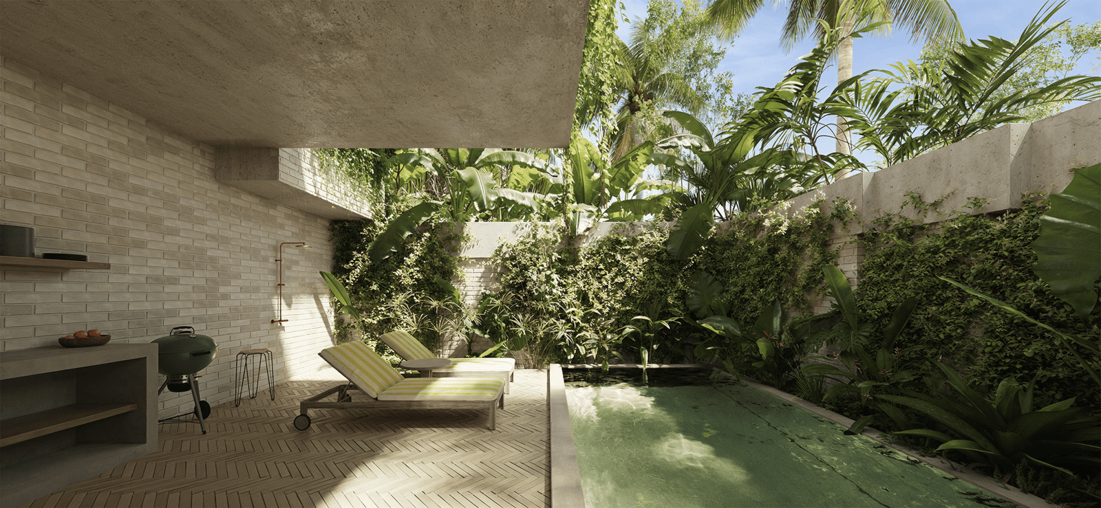 Zona común con alberca, asador y espacios rodeados de vegetación nativa para relajarte, trabajar o convivir.